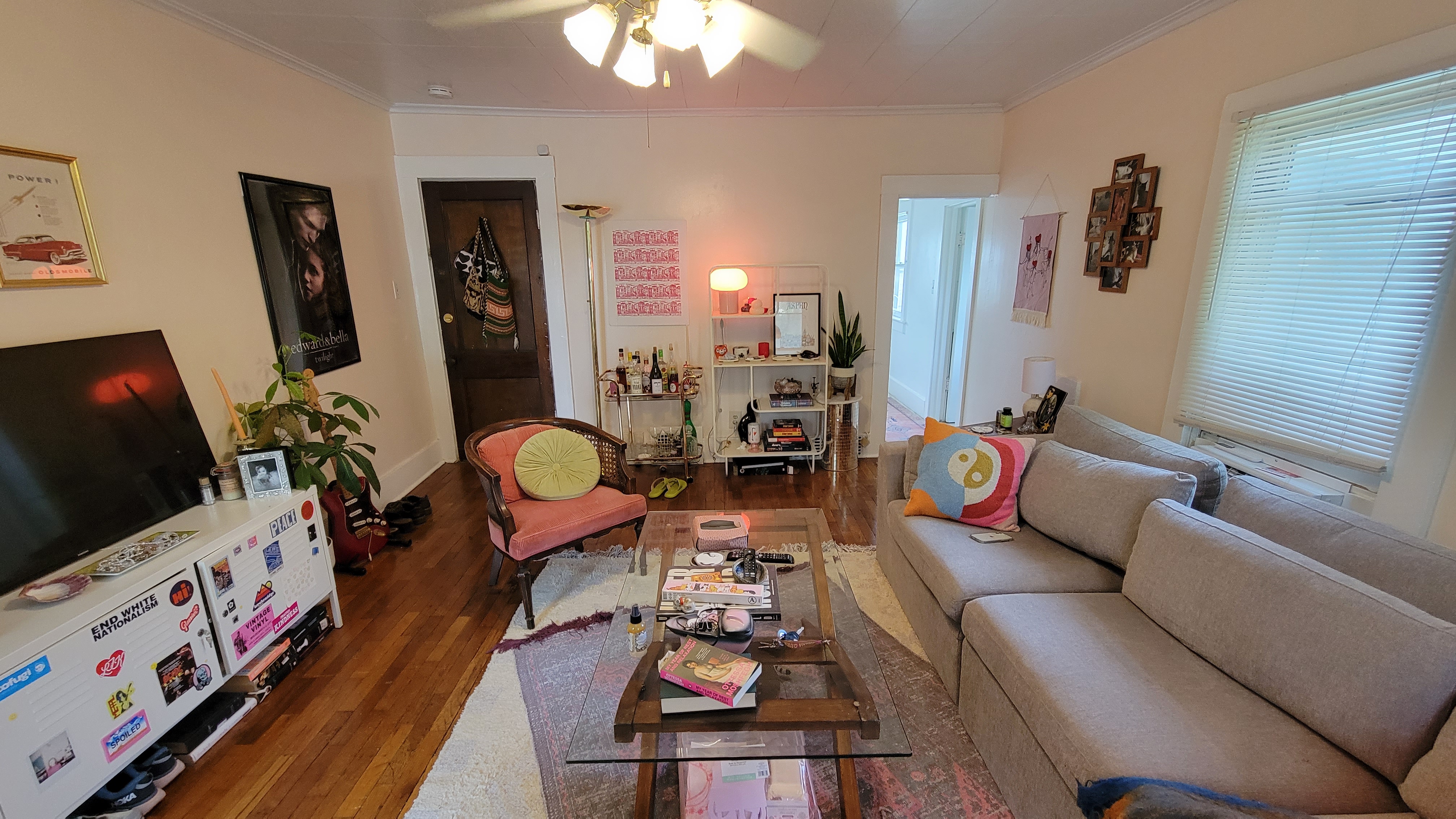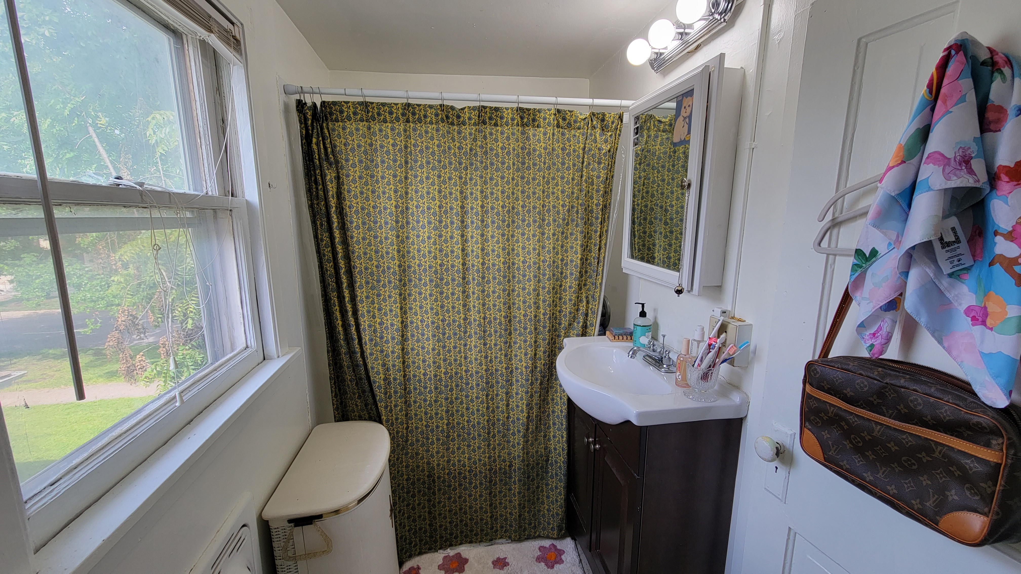 When you enter the apartment, you are in the living room. It has wood floors, ceiling fan, and a window air conditioner. If you turn left from the front door, you come to a hall off the living room. Off the hall, on the right is the bathroom with a tub shower combination.