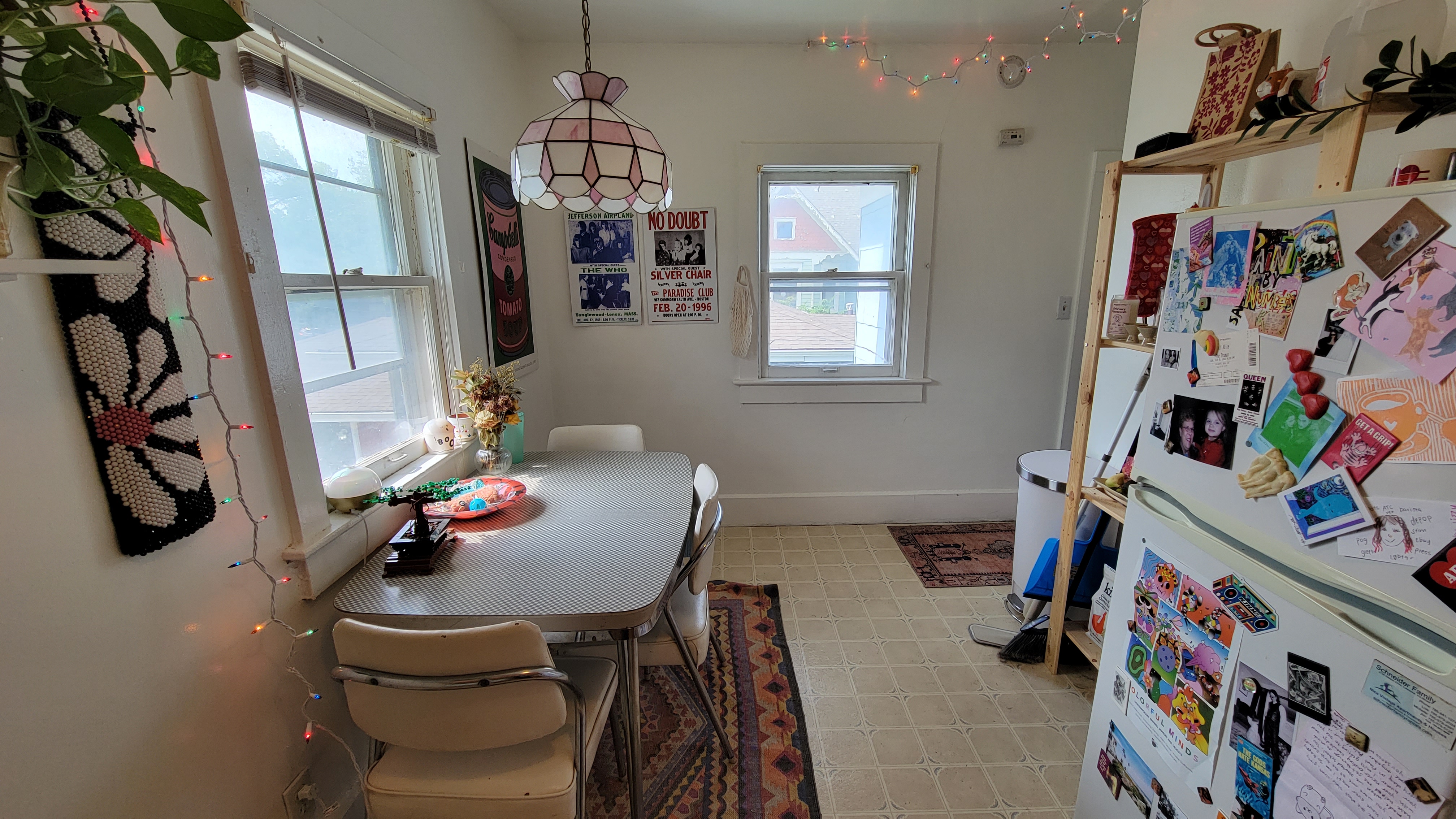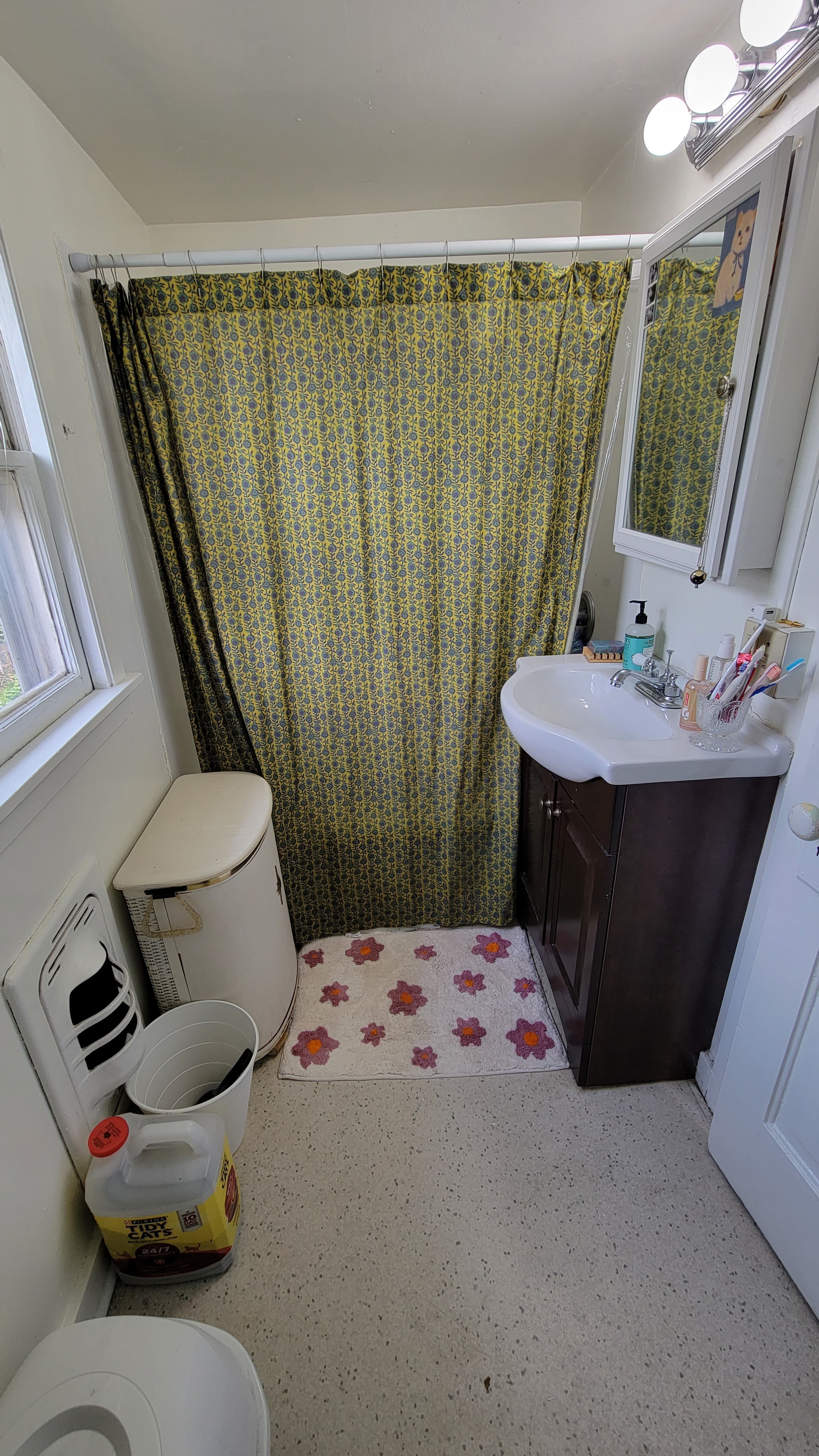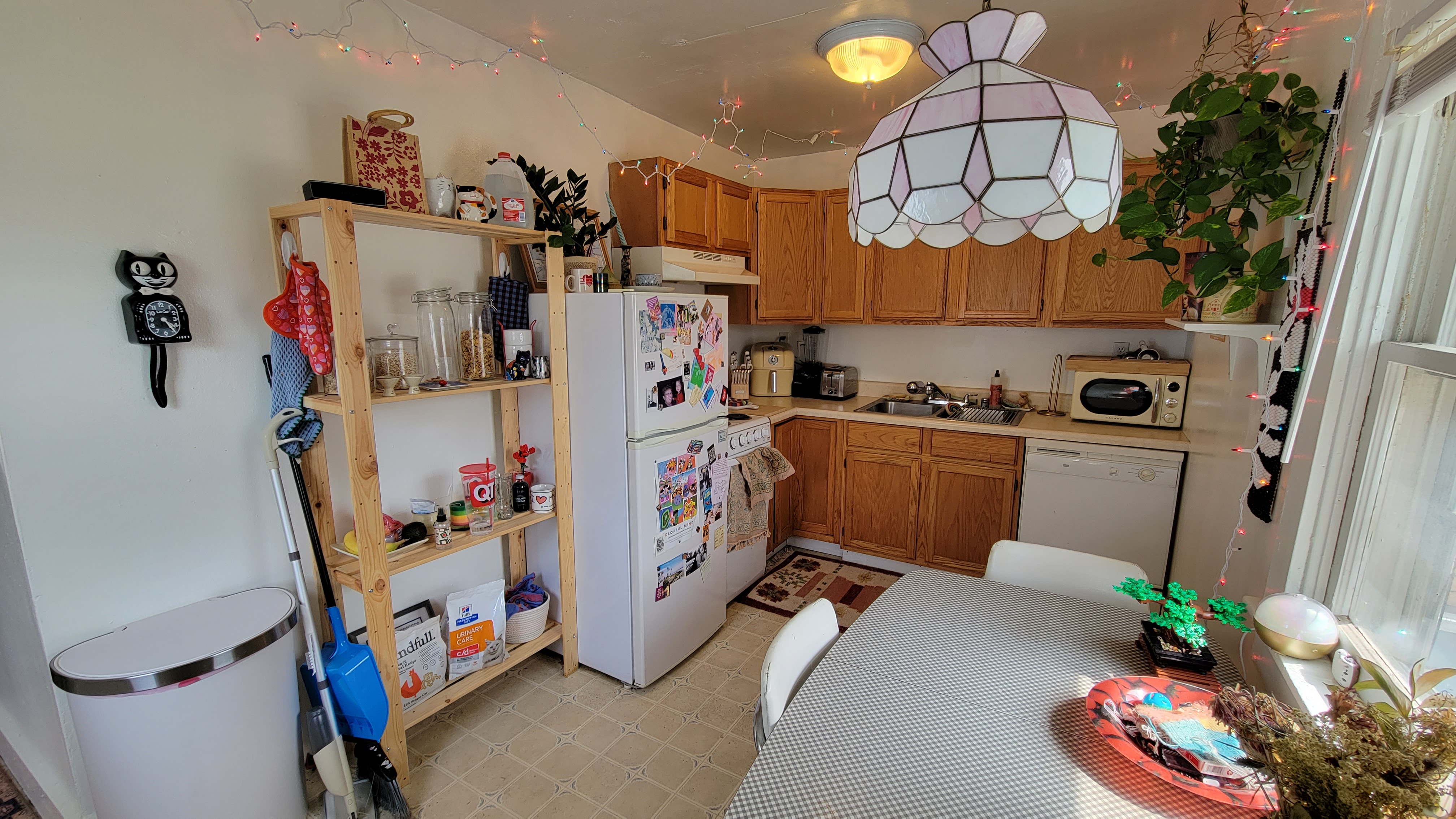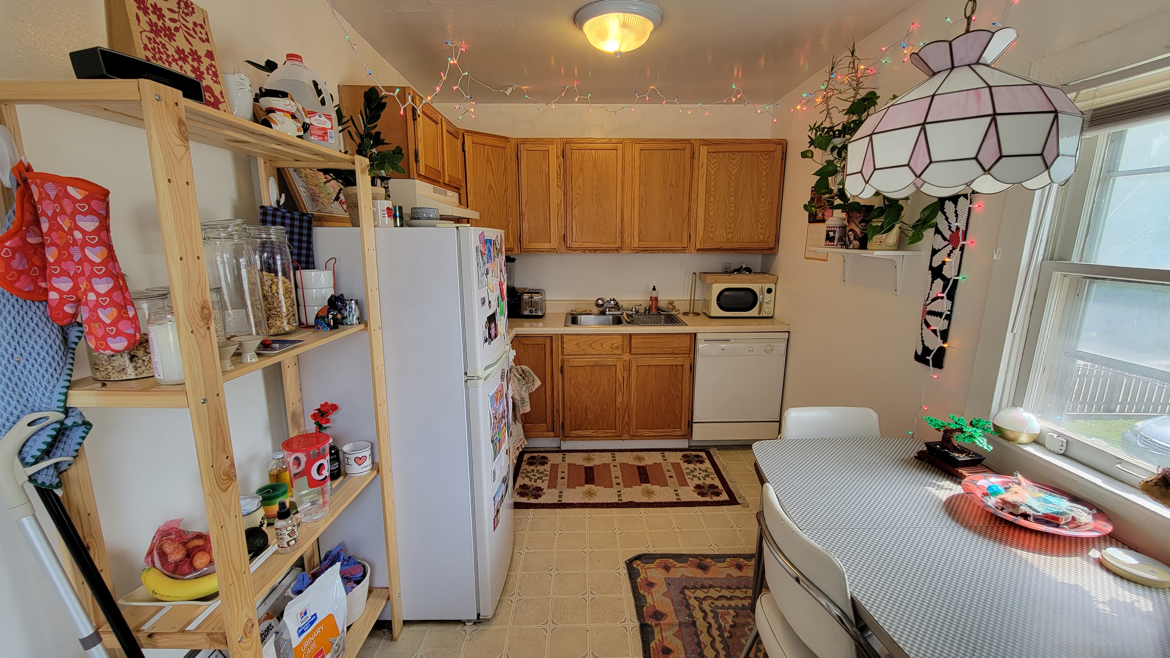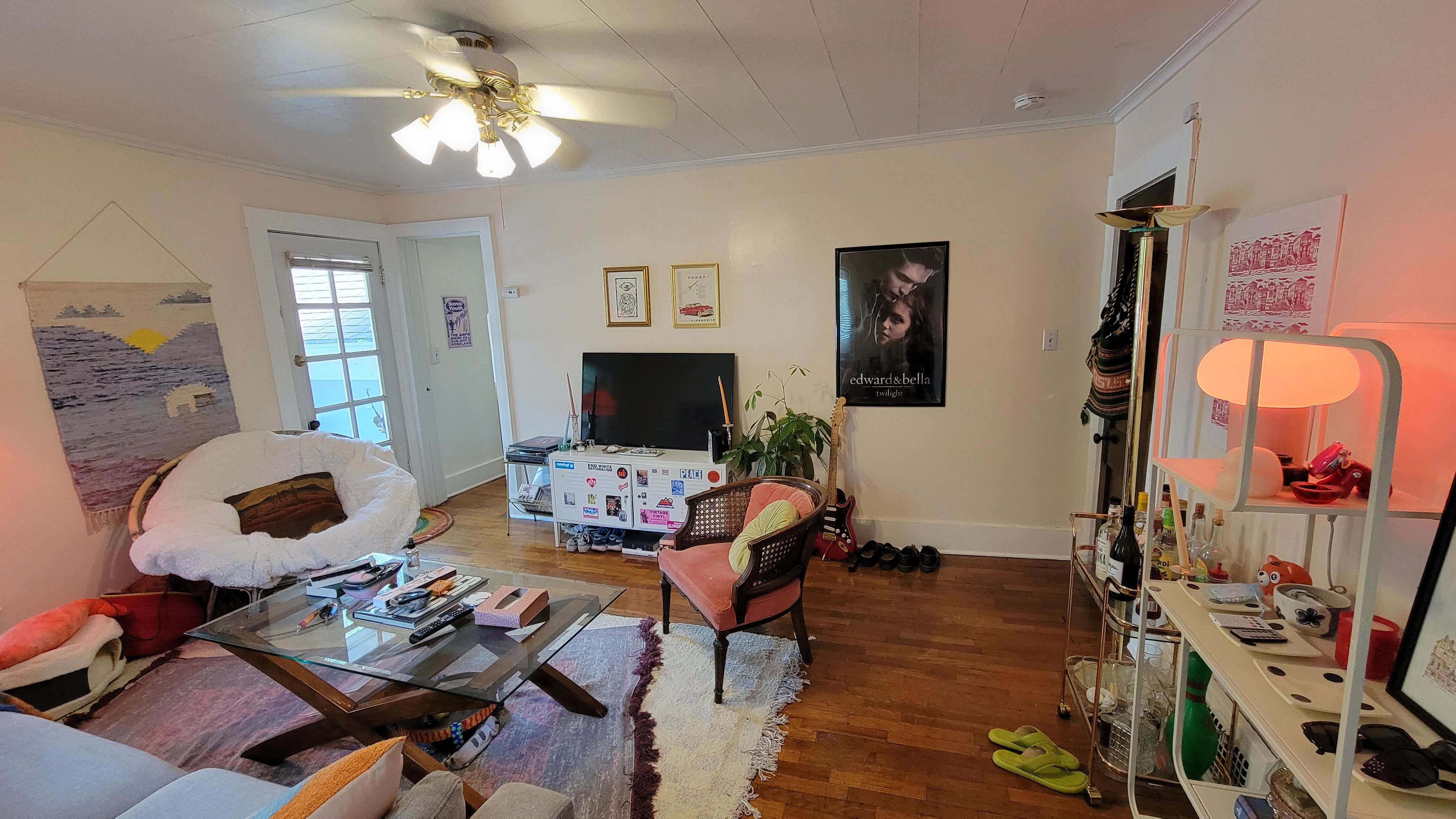 There is a door in the back of the house that takes you to the shared laundry room in the basement. There is a shared basement laundry room with a free full size washer and dryer. Behind the house, you will have access to off street parking. This apartment gets 1 parking space.