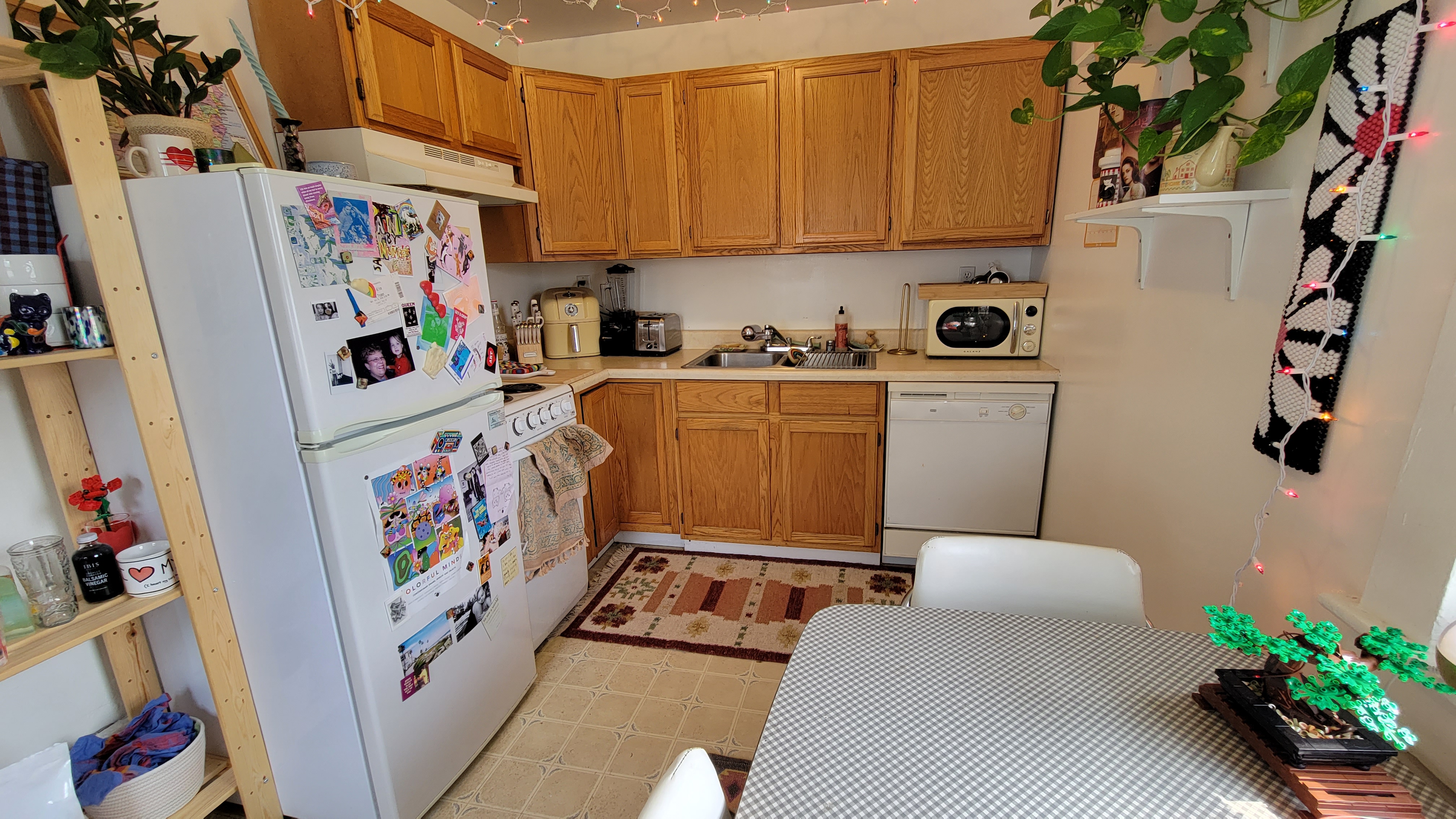 If you stay in the hall, it leads into a small kitchen that has room for a small table and chairs. The kitchen has light oak cabinets, stove, refrigerator, and a dishwasher.