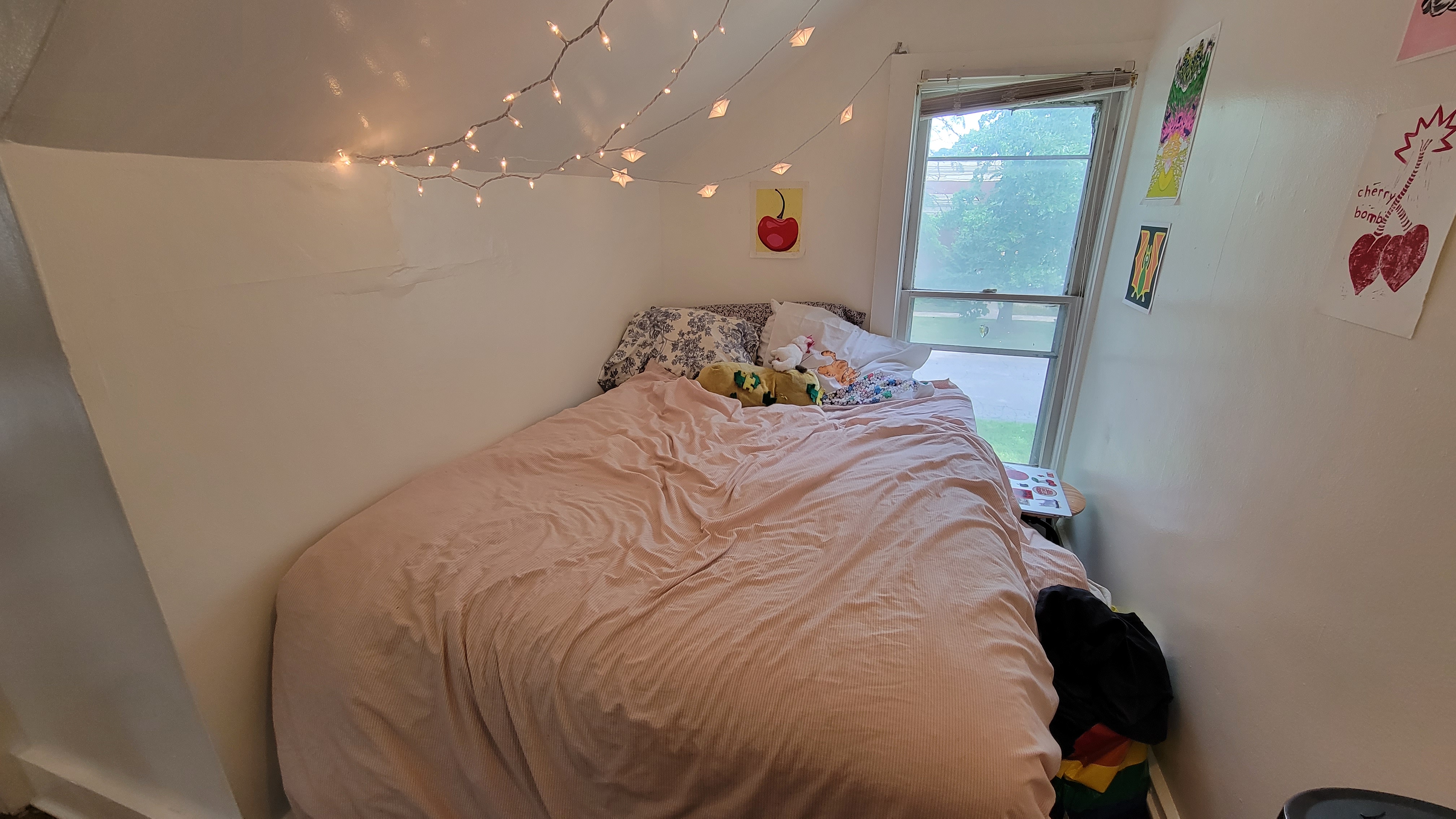 On the opposite end of the living room, you turn right into the bedroom. The bedroom has a window air conditioner. It is small, but holds a queen size bed. It has a large double closet with sliding mirror doors.