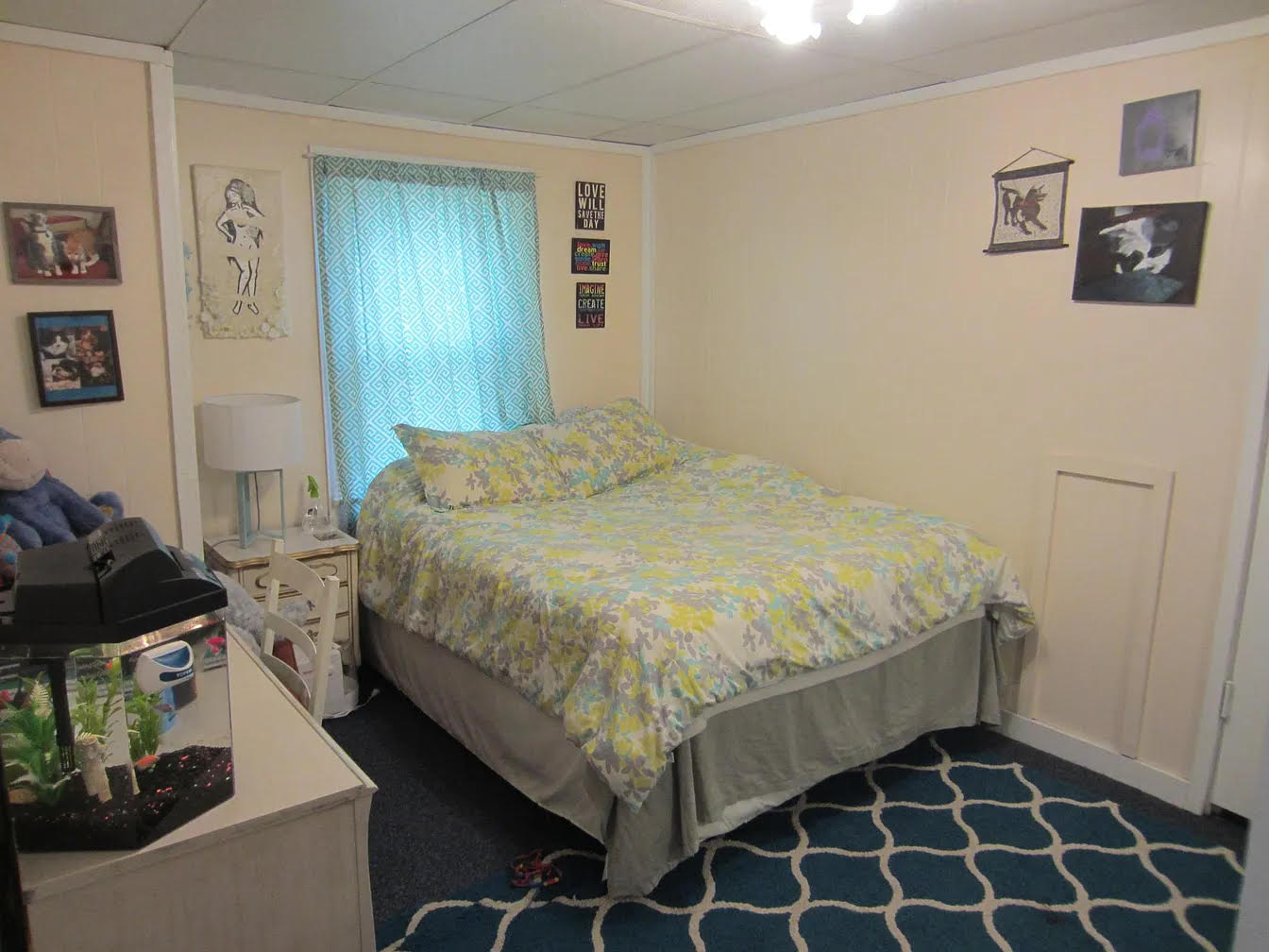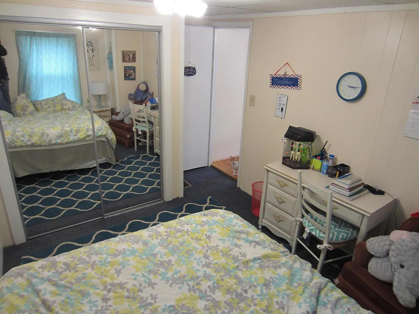 Both bedrooms are large, big enough to hold a bed, a dresser and a desk a bookcase and night stands. They both have wall to wall carpeting, ceiling fans, and double closets with sliding mirror doors, and dormered ceilings. (Sometimes this bedroom is used as a living room.)