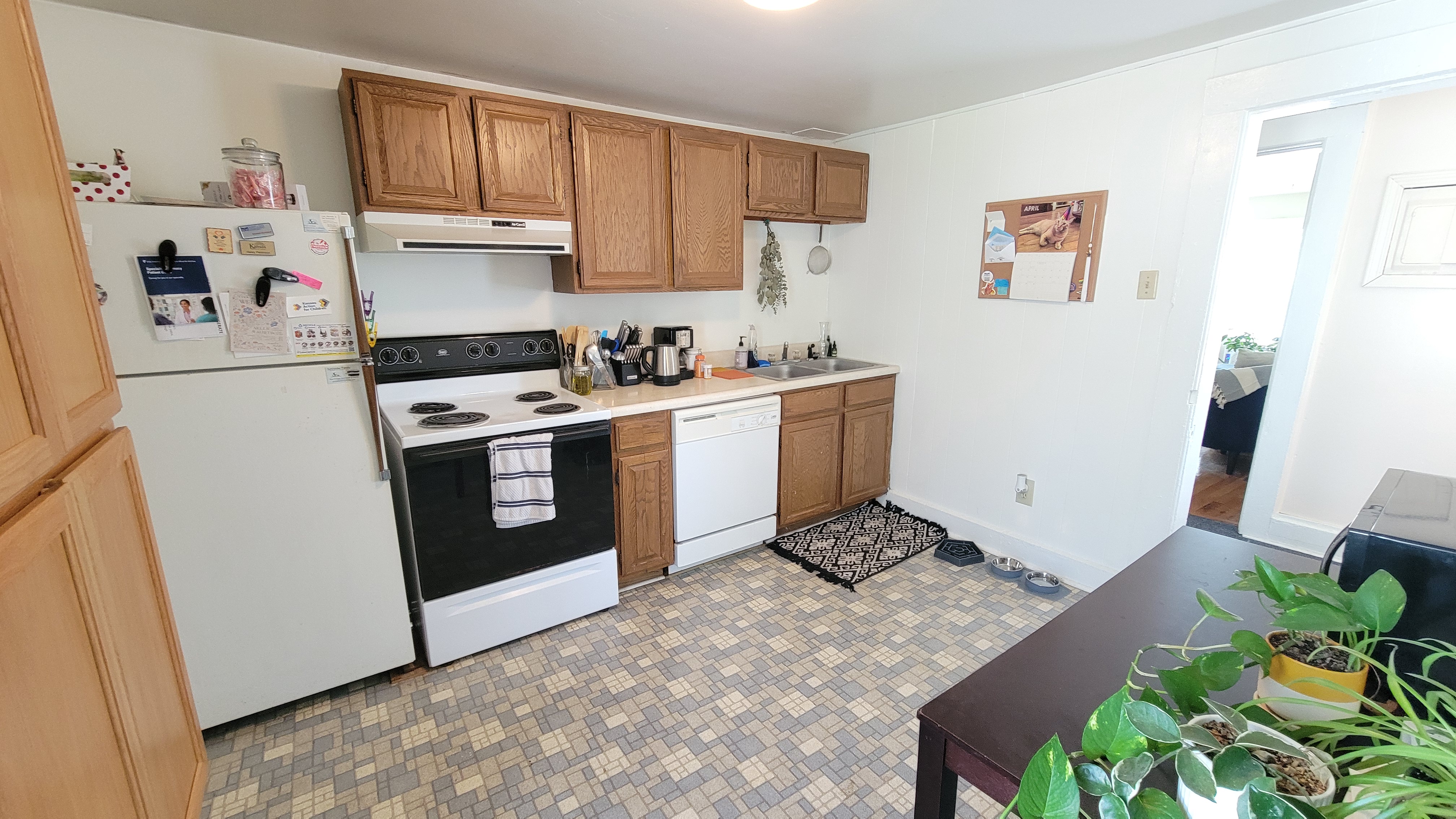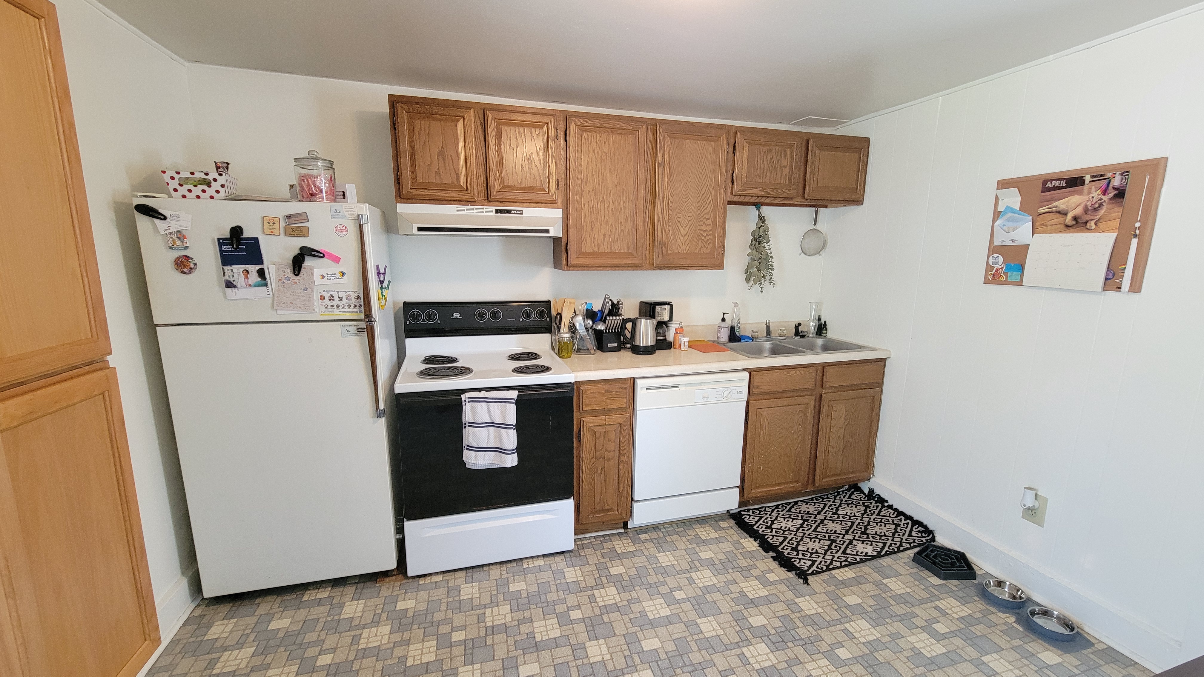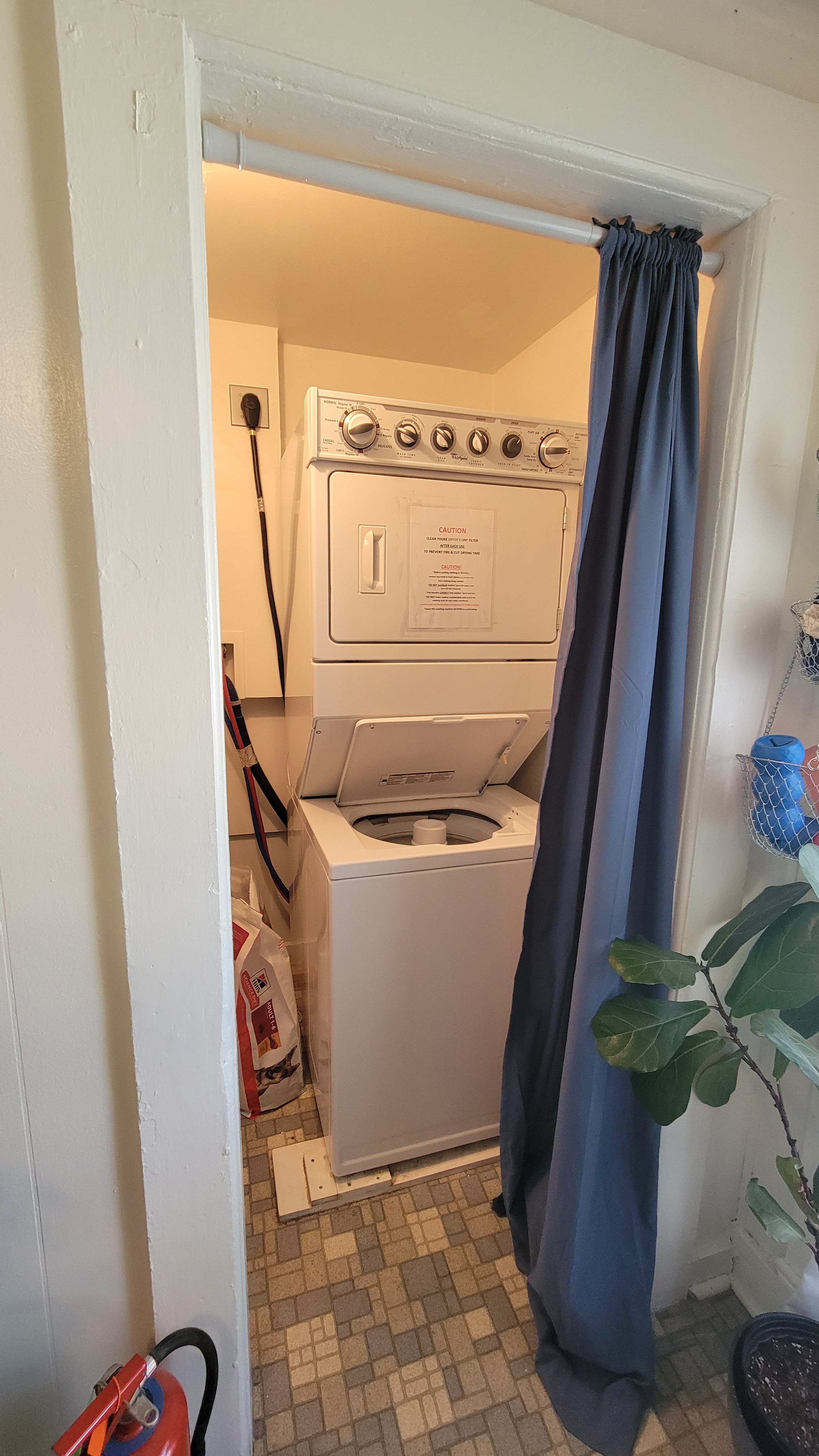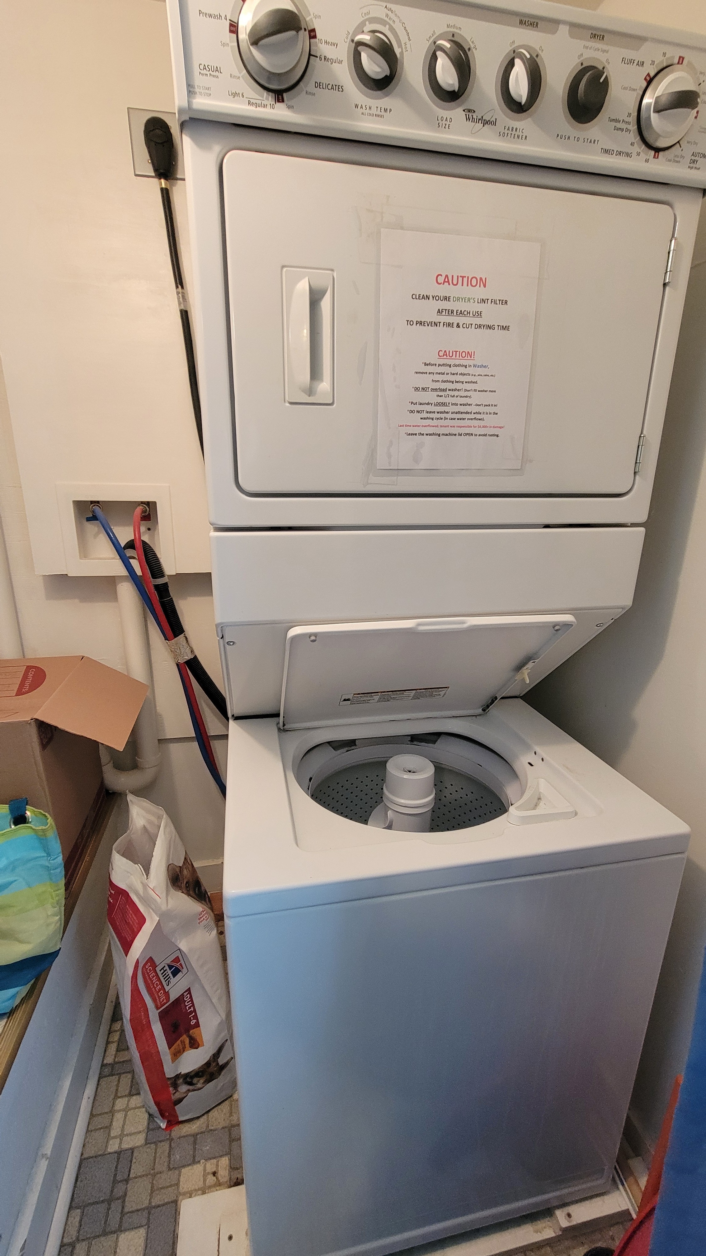Next to the bedroom and across from the living room is the kitchen. It has room for a table and chairs. It has dark oak cabinets, full size stove, refrigerator, dishwasher, and washer/dryer stack unit. If you go right at the top of the stairs, you walk into the bathroom. It has a tub shower combination and built in shelves.  This apartment has a forced air gas furnace.