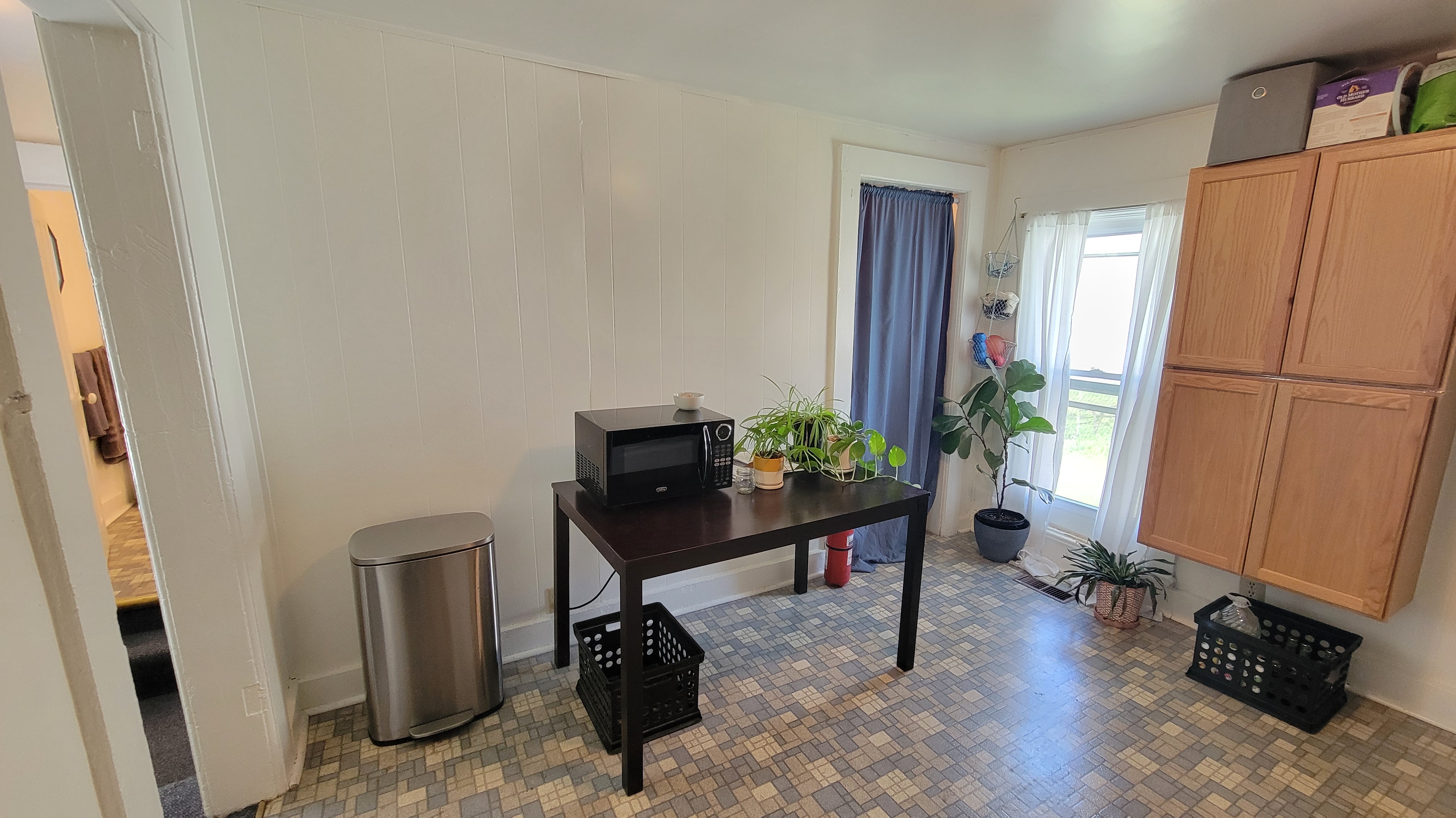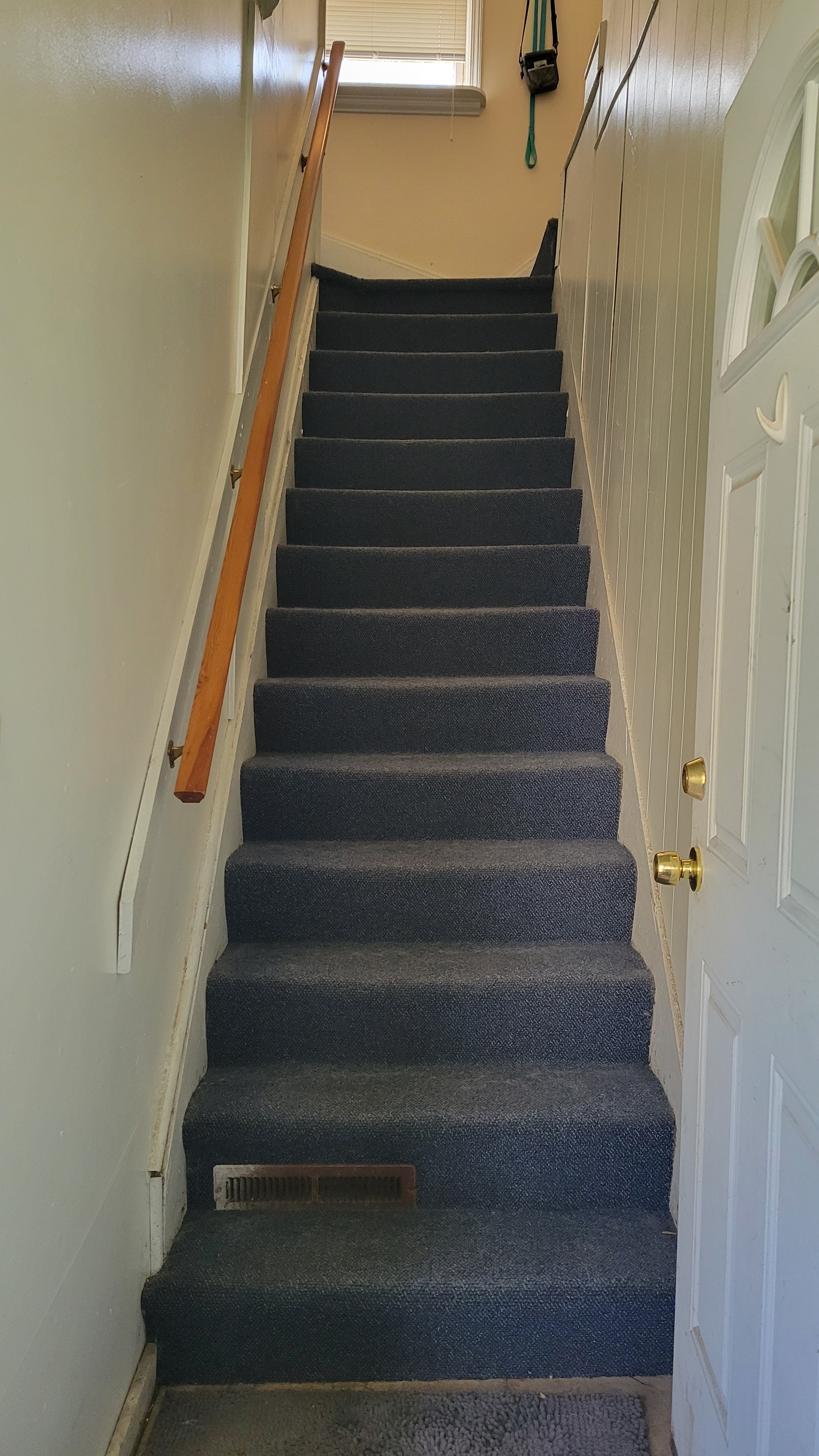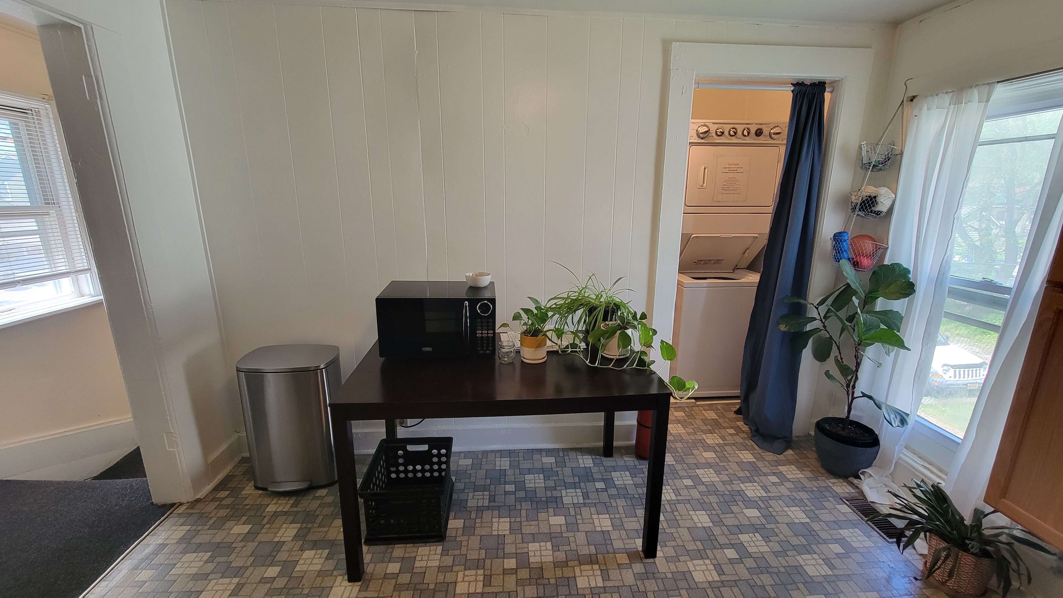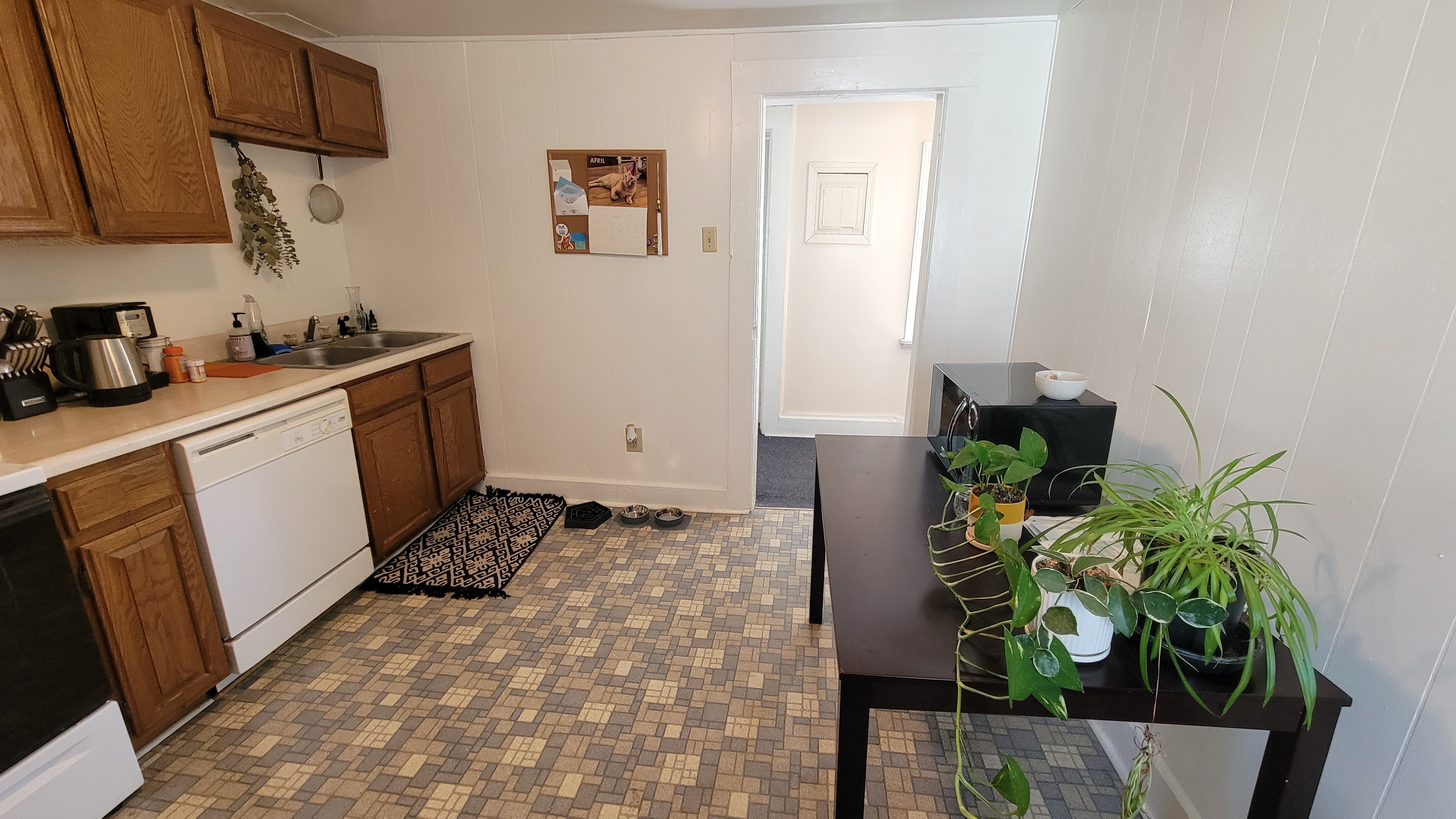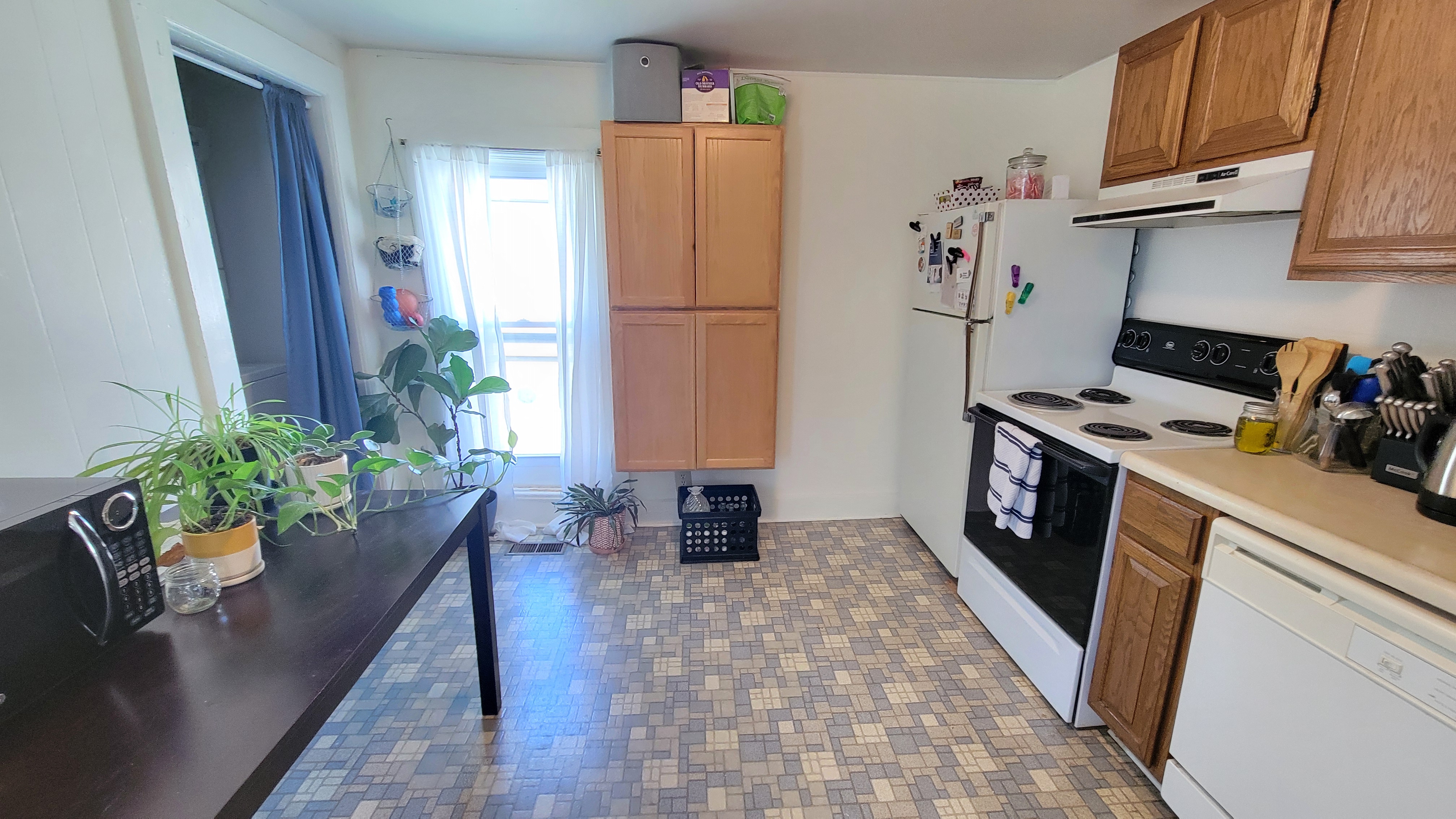 Next to the bedroom and across from the living room is the kitchen. It has room for a table and chairs. It has dark oak cabinets, full size stove, refrigerator, dishwasher, and washer/dryer stack unit. If you go right at the top of the stairs, you walk into the bathroom. It has a tub shower combination and built in shelves.  This apartment has a forced air gas furnace.