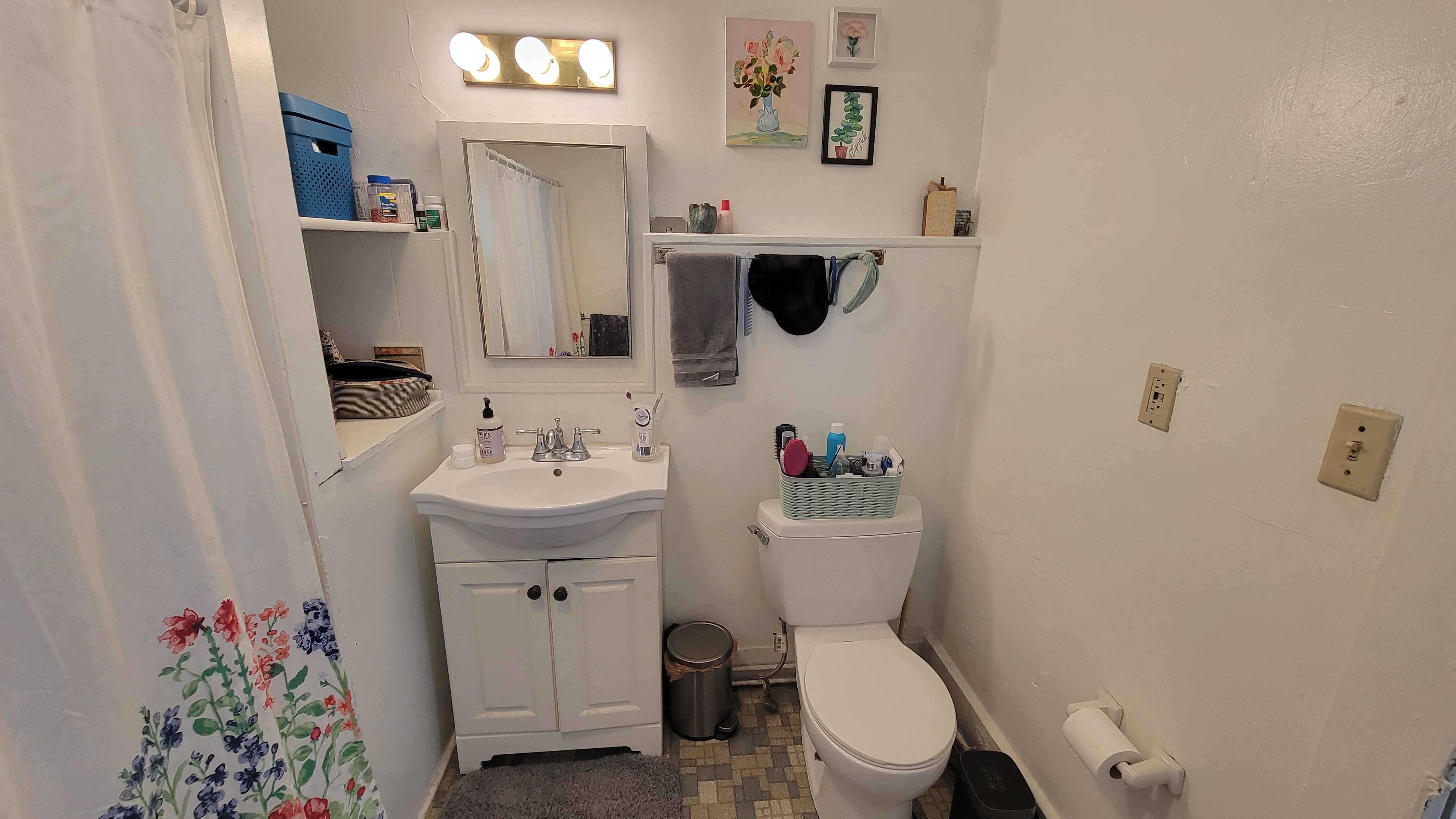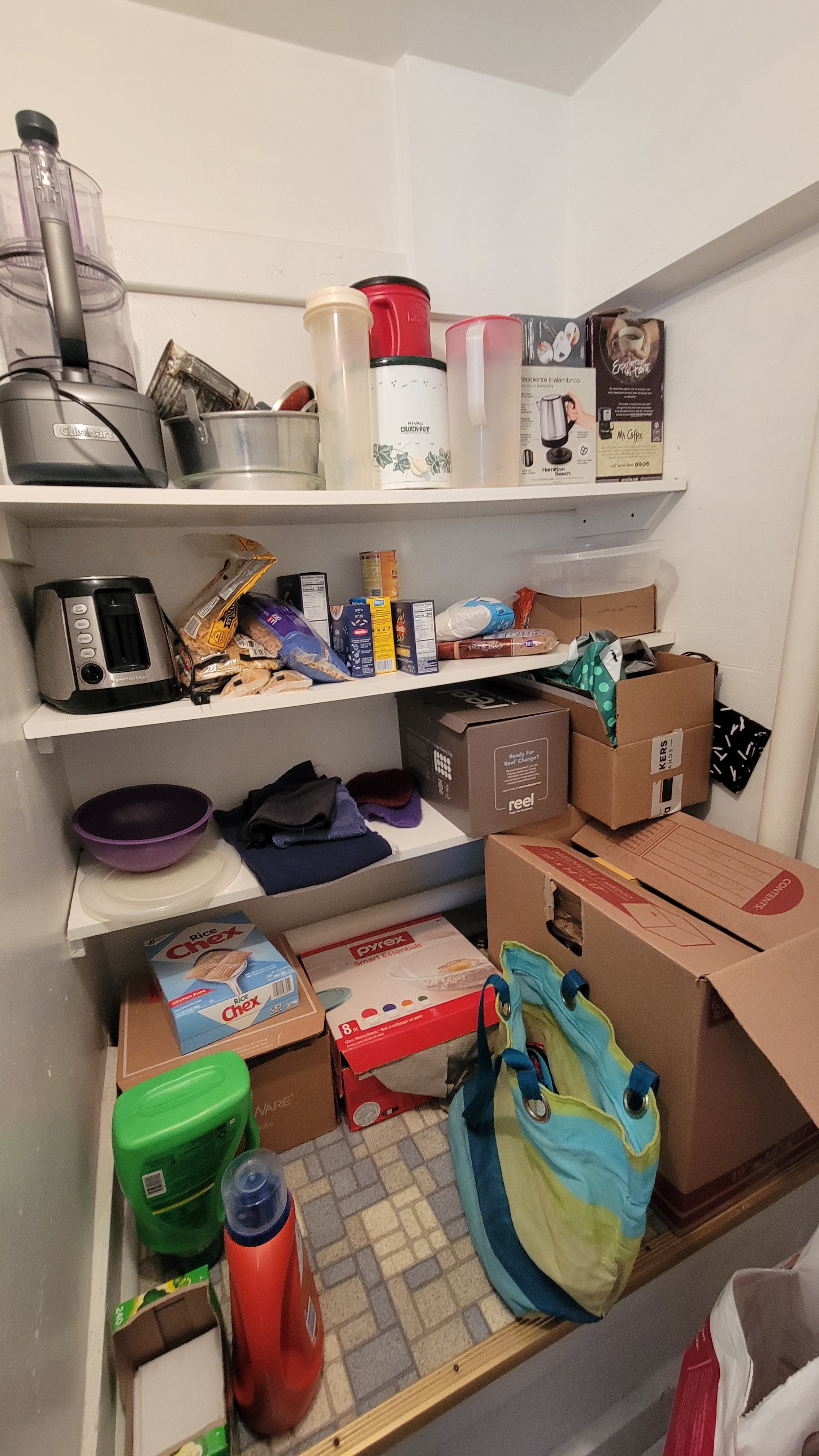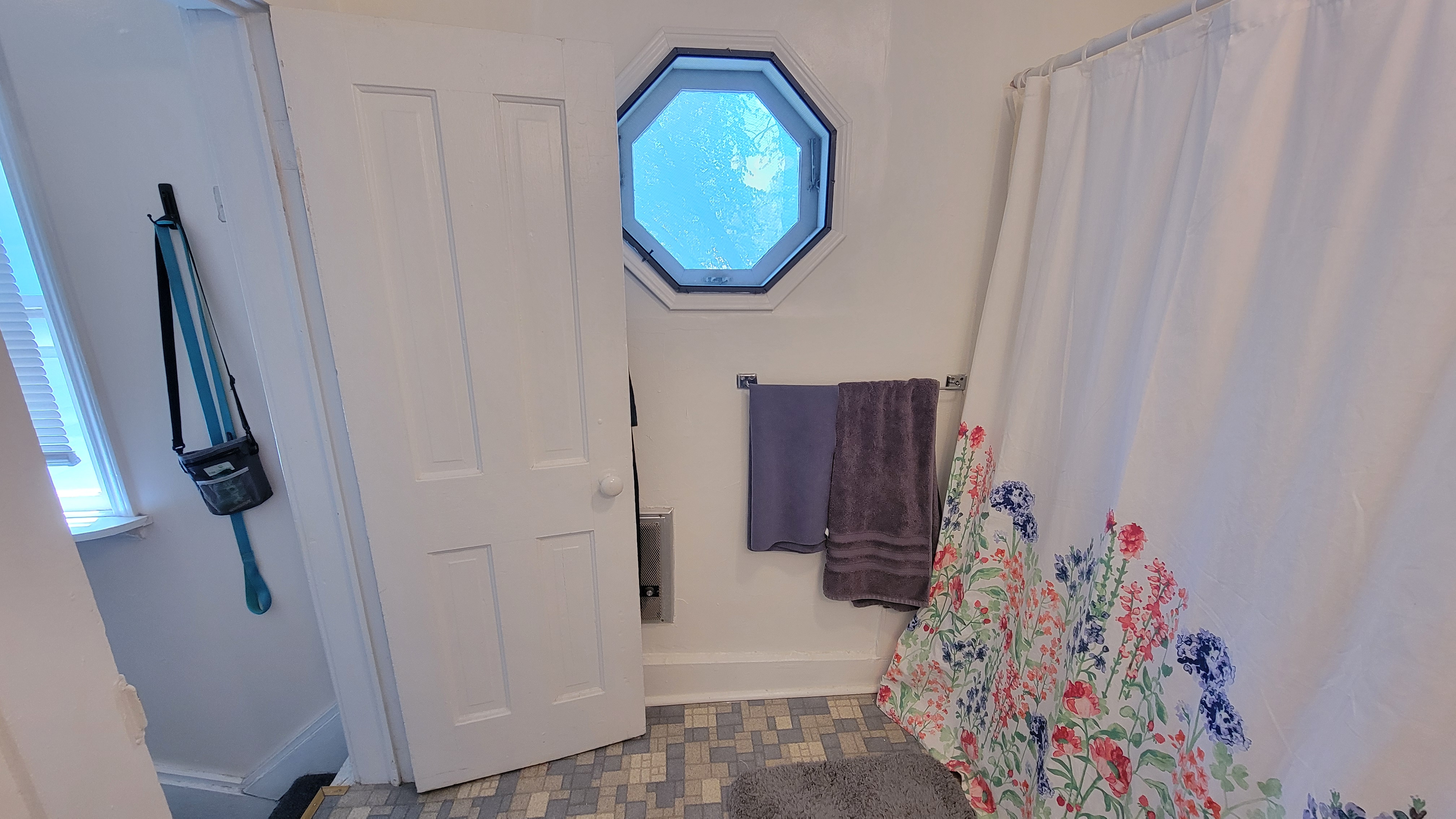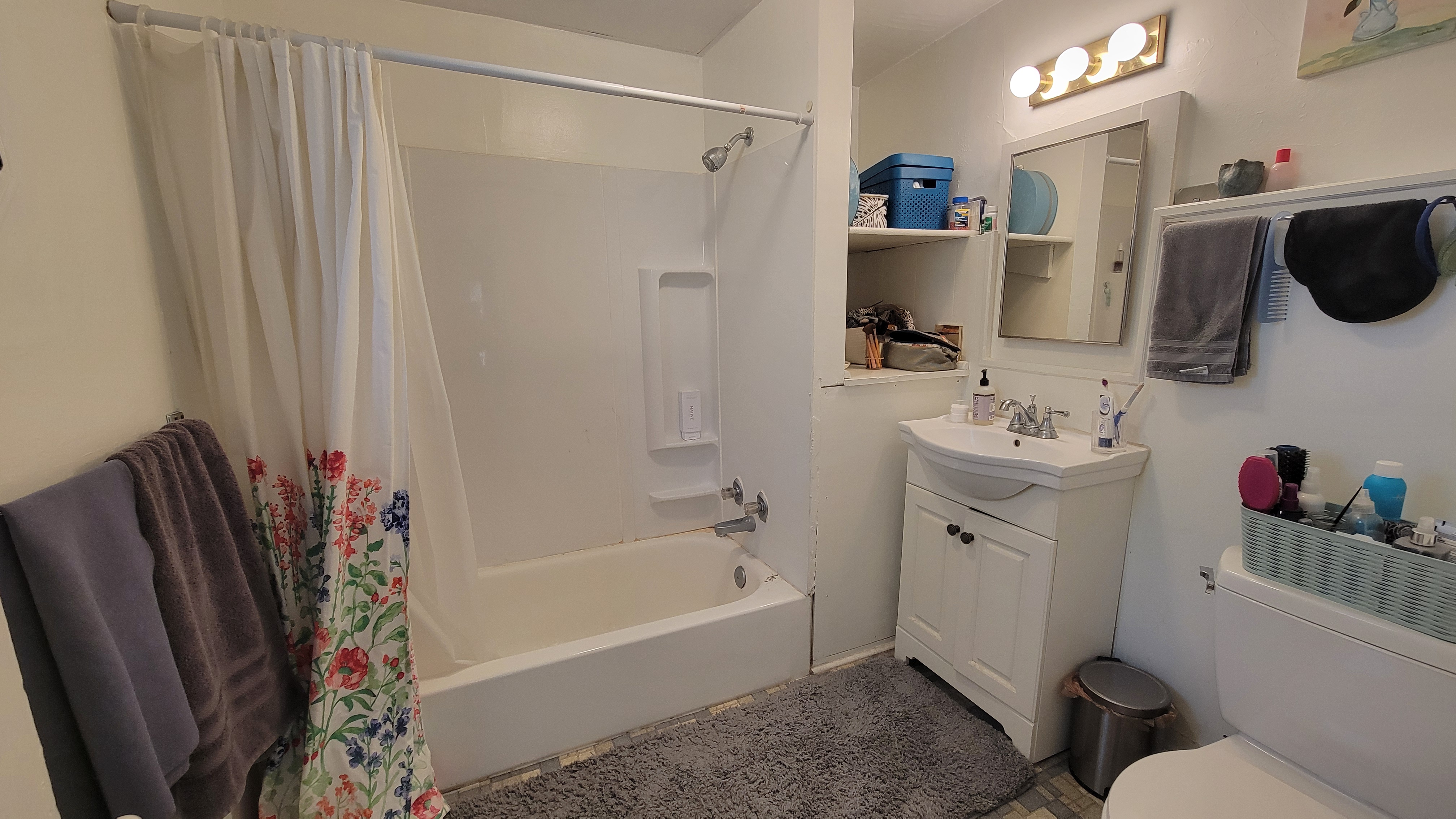 Next to the bedroom and across from the living room is the kitchen. It has room for a table and chairs. It has dark oak cabinets, full size stove, refrigerator, dishwasher, and washer/dryer stack unit. If you go right at the top of the stairs, you walk into the bathroom. It has a tub shower combination and built in shelves.  This apartment has a forced air gas furnace.