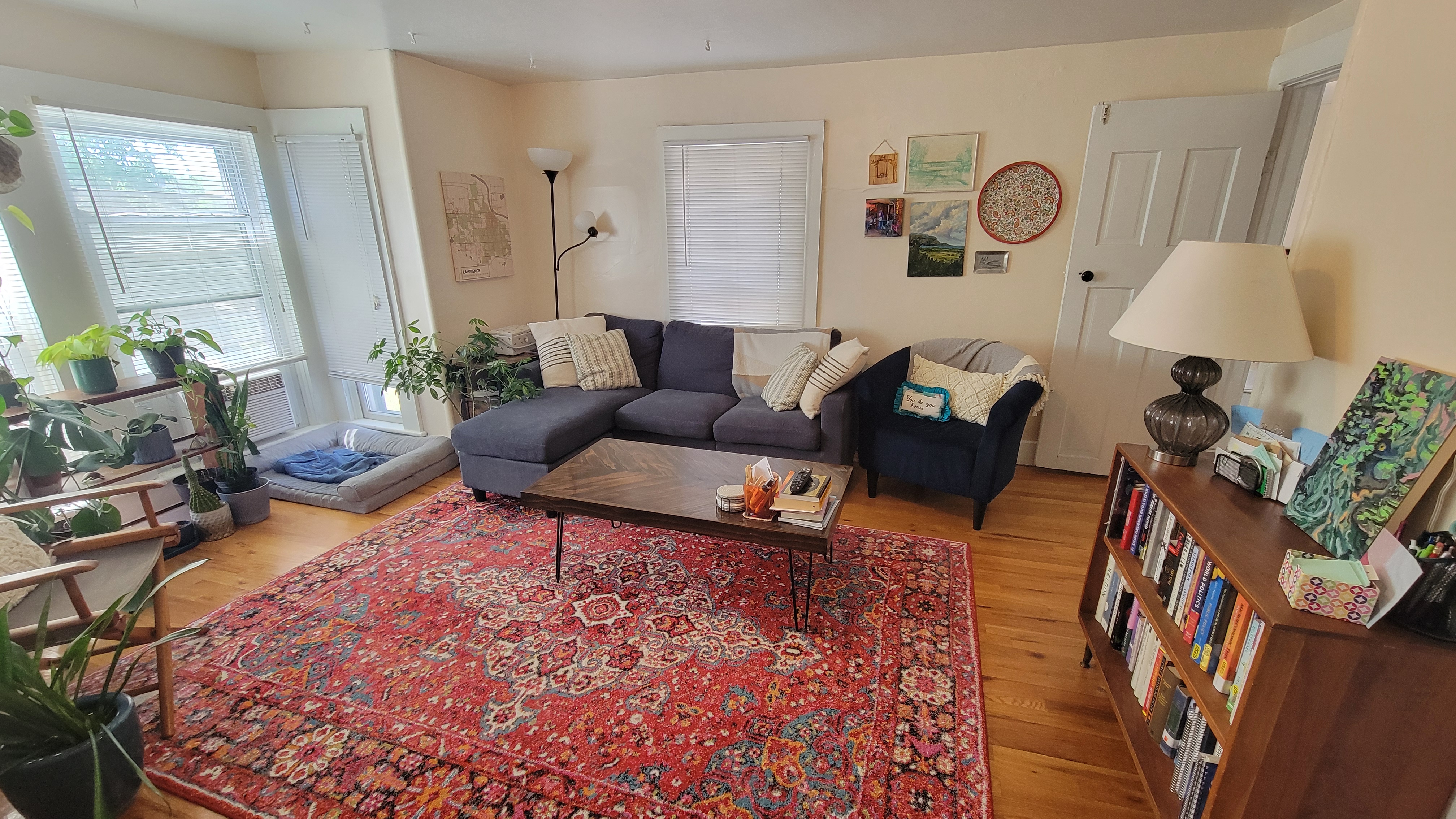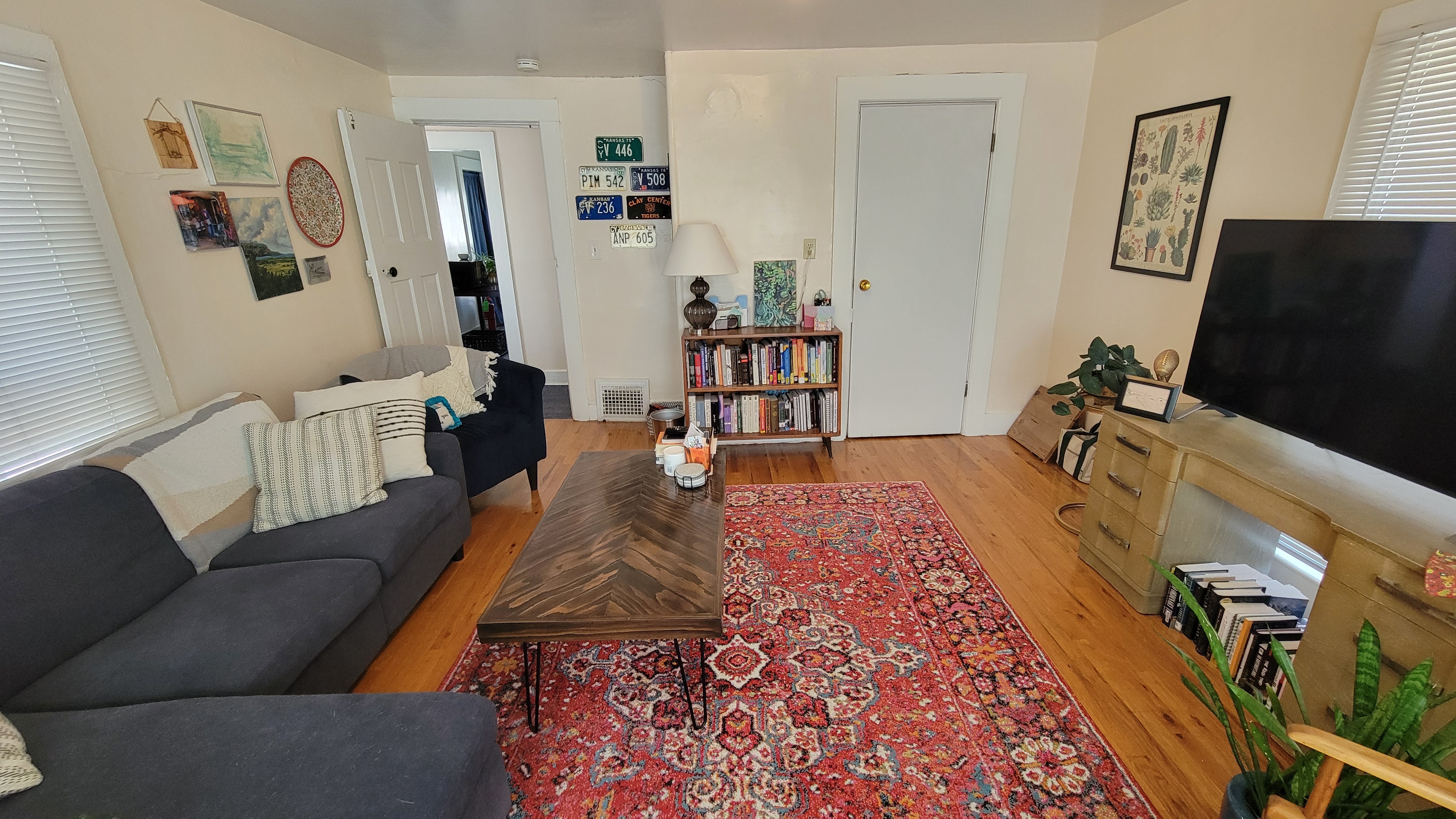 When you reach the top of the stairs you can either go right or left. If you go left, you are in the hall and off the hall is a large living room.  It has big bay windows plus 2 regular windows, window air conditioner, wood floor and a double size closet.