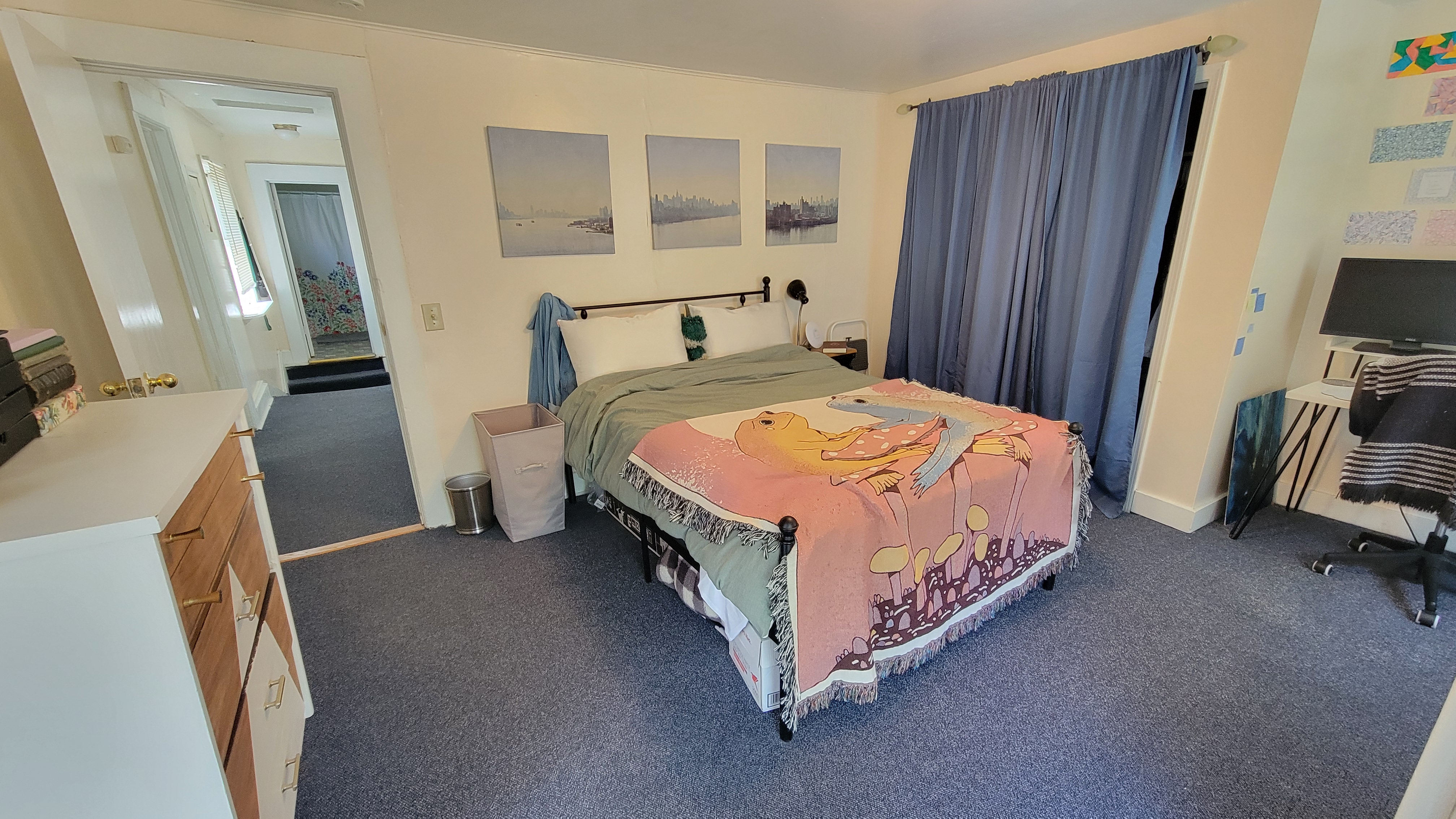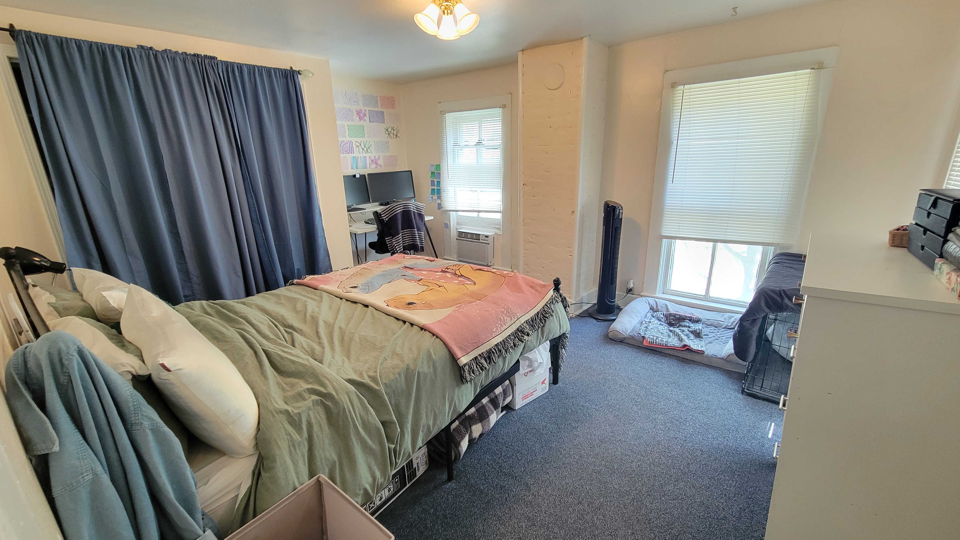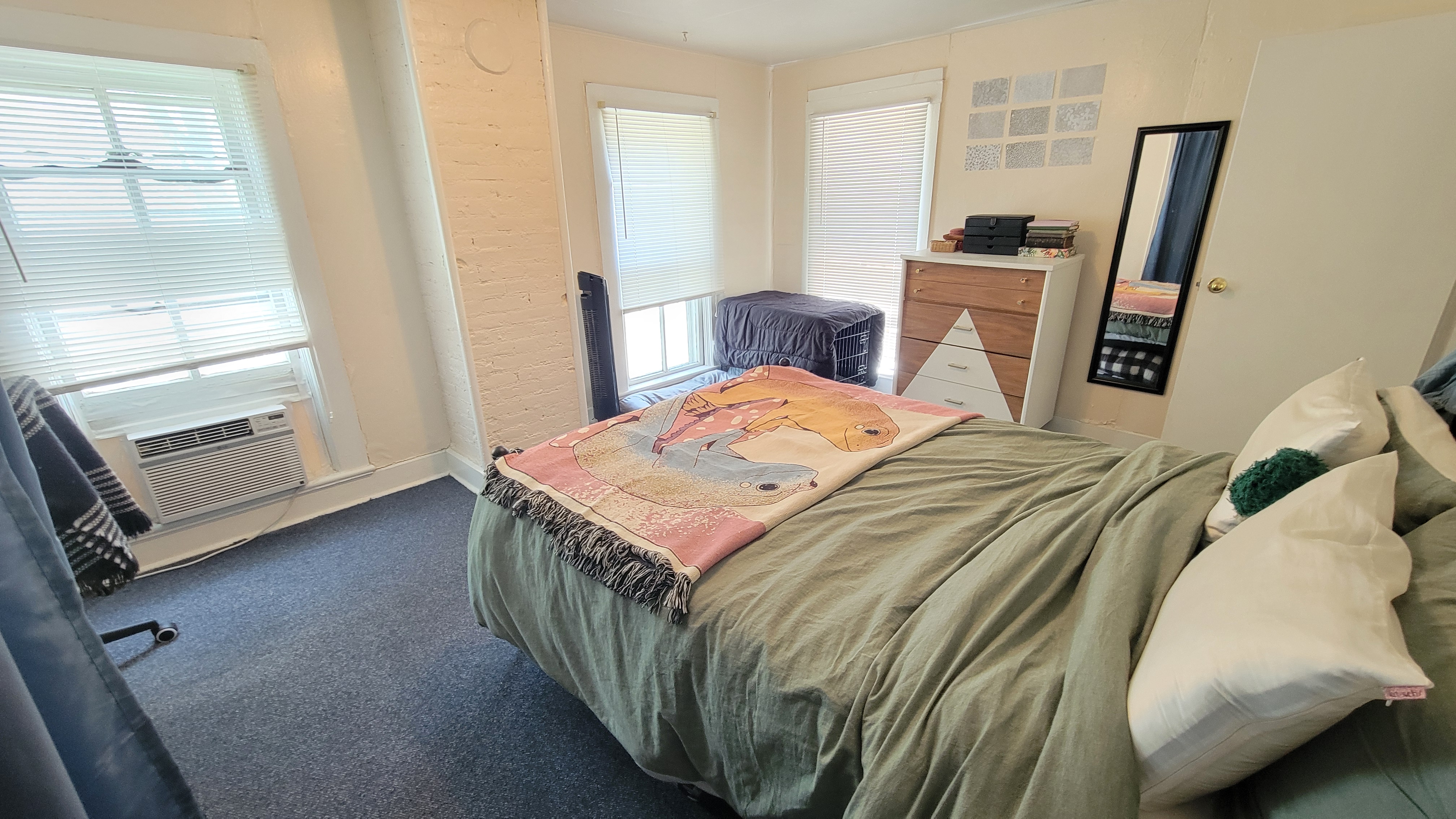 The next room off the hall is a large bedroom. It has a nook, 3 windows, double size closet, window air conditioner, wall to wall carpeting.  It is large enough to hold a bed, dresser, and desk.