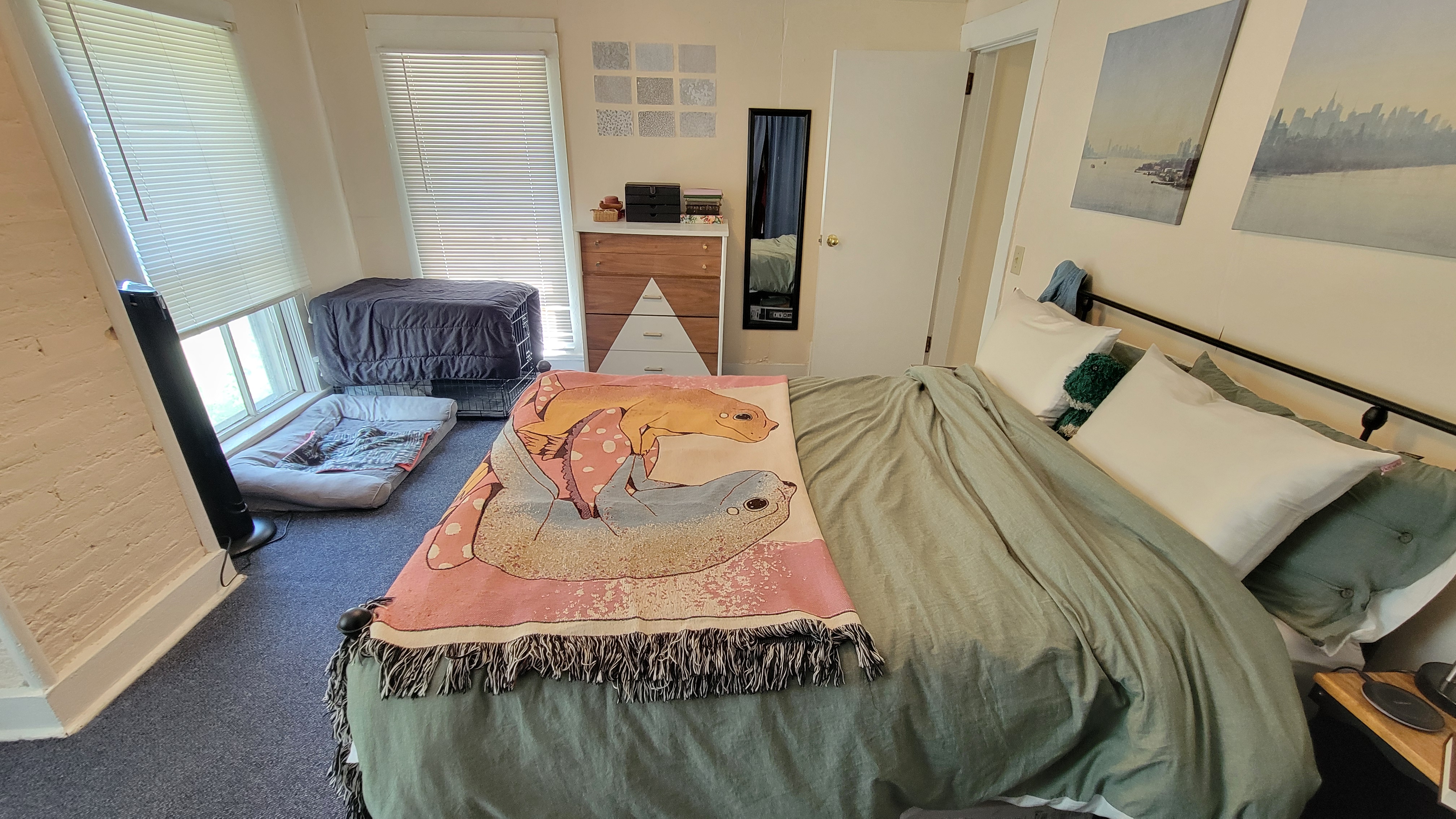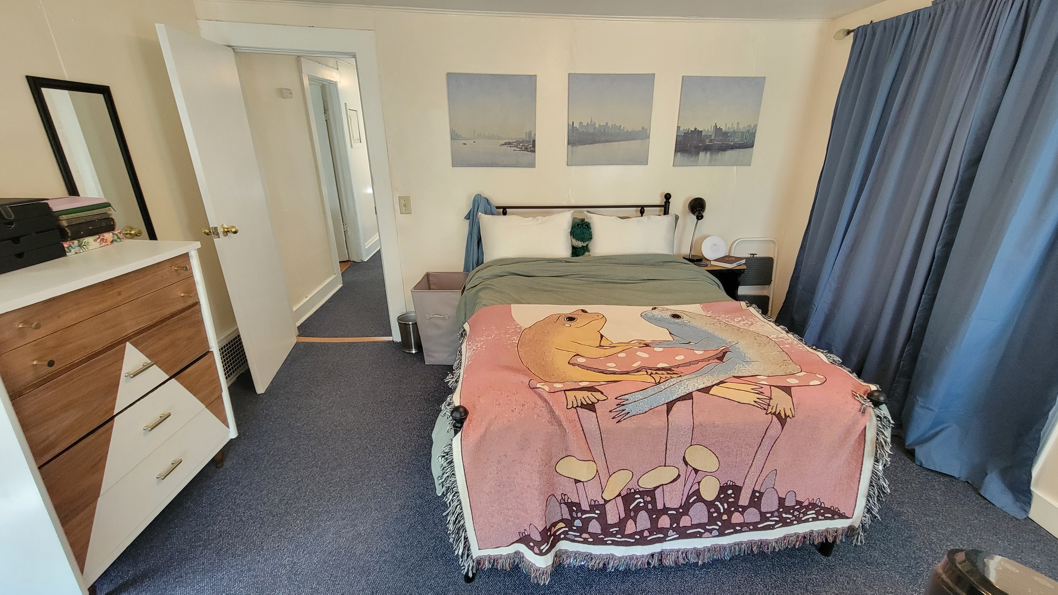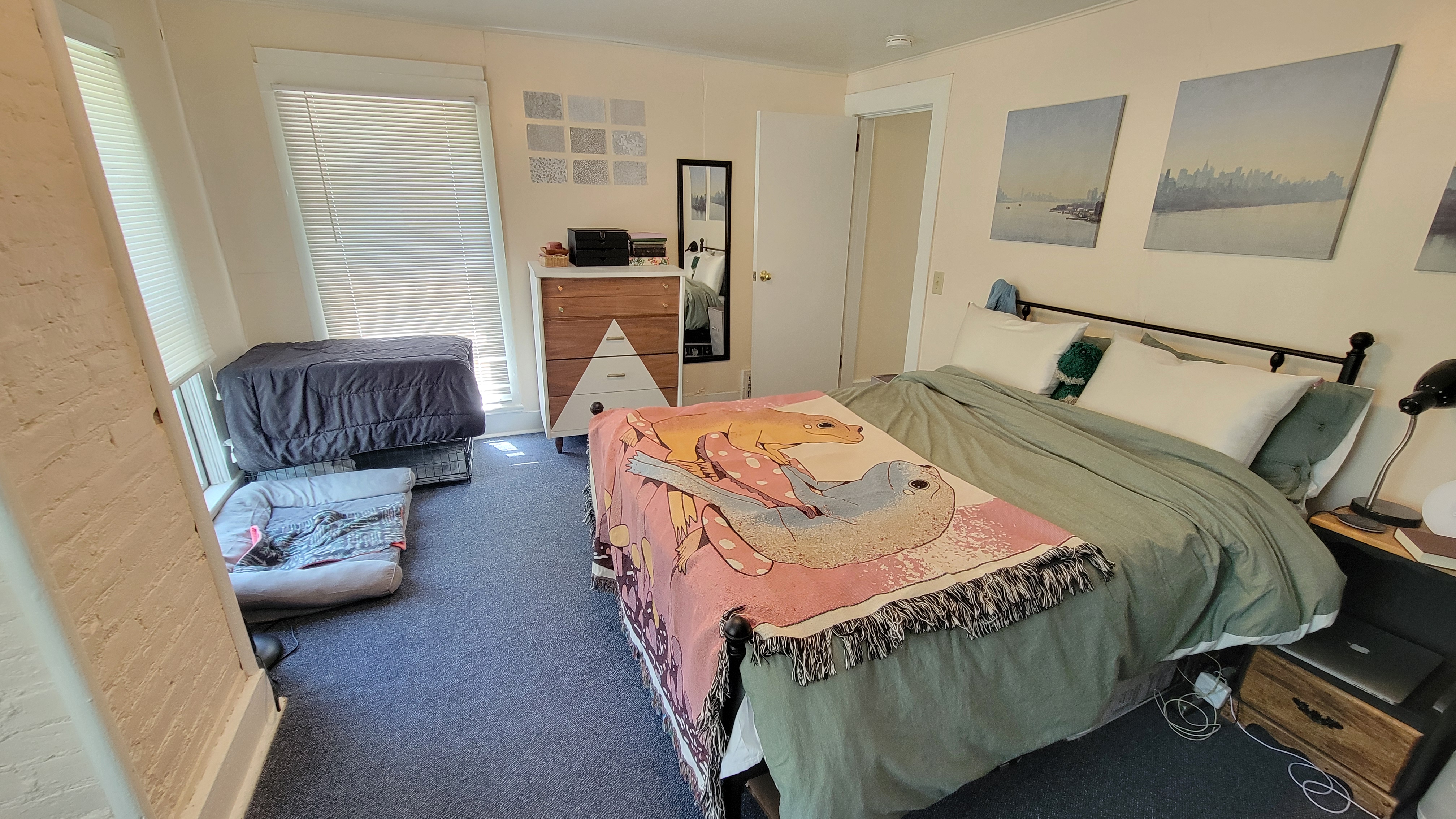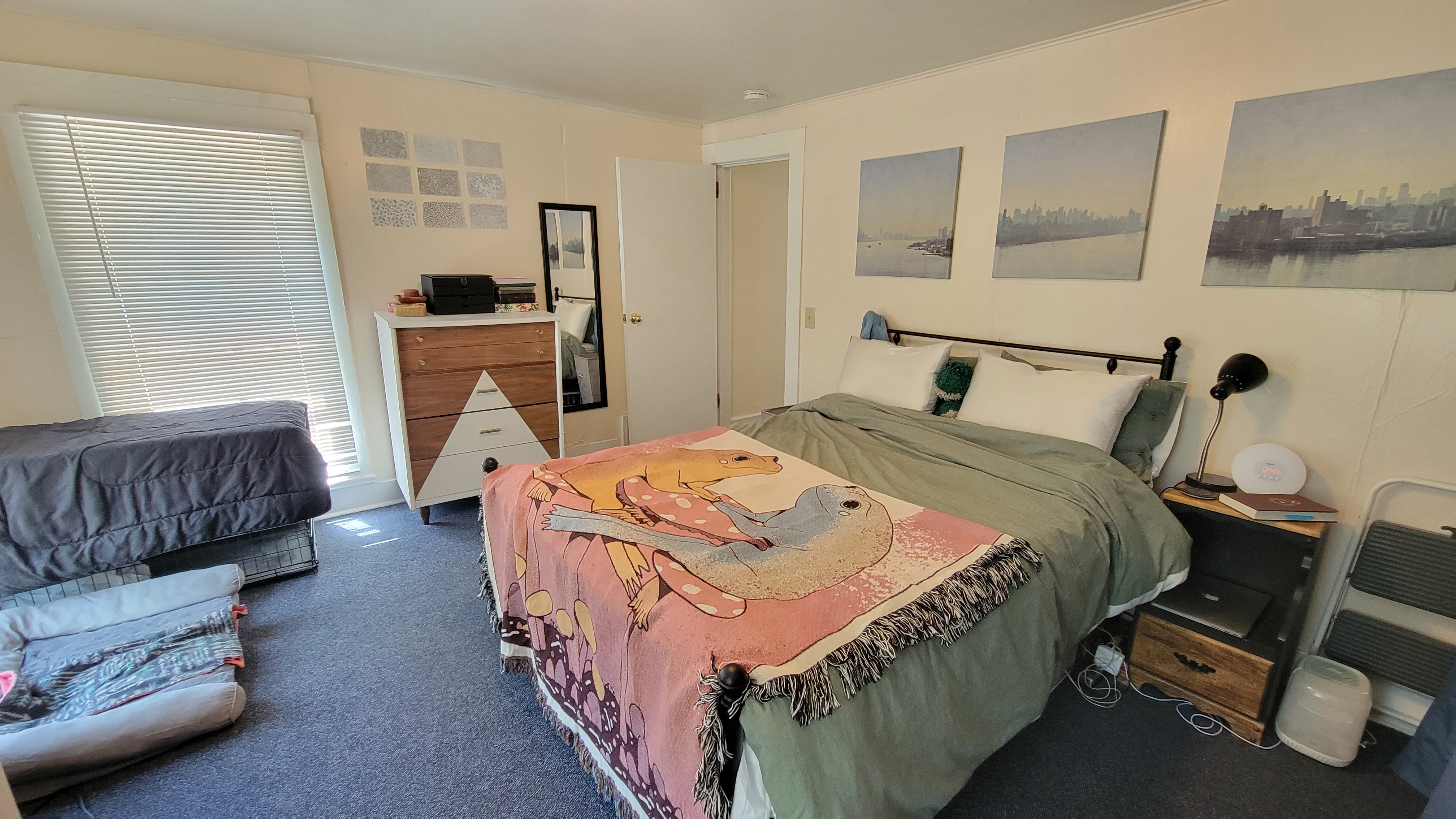 The next room off the hall is a large bedroom. It has a nook, 3 windows, double size closet, window air conditioner, wall to wall carpeting.  It is large enough to hold a bed, dresser, and desk.